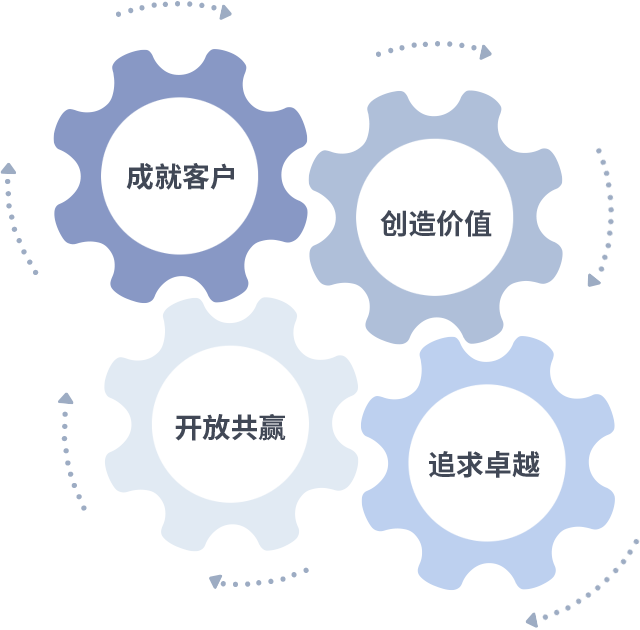 成就客户是一切决策的出发点,,,创造价值是衡量所有工作的标准,,,追求卓越是我们做事做人的态度,,,开放共赢是我们的格局也是最终的结果。。。价值观的齿轮环环相扣,,,推动着组织里的每个人不断向前。。。。